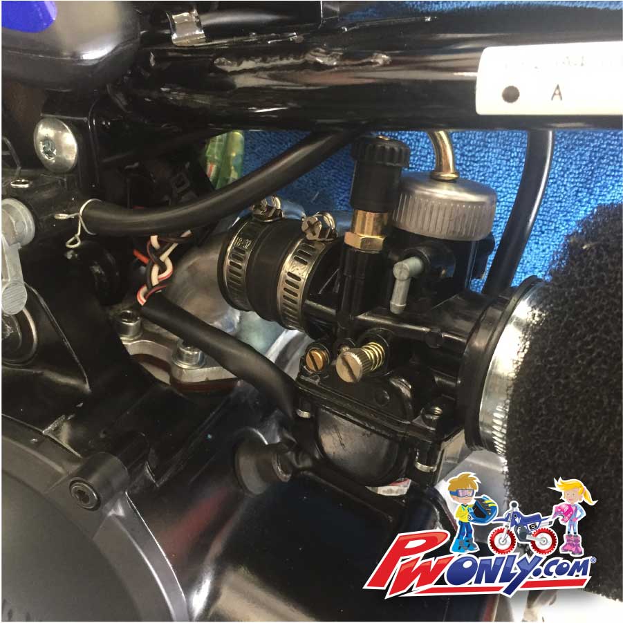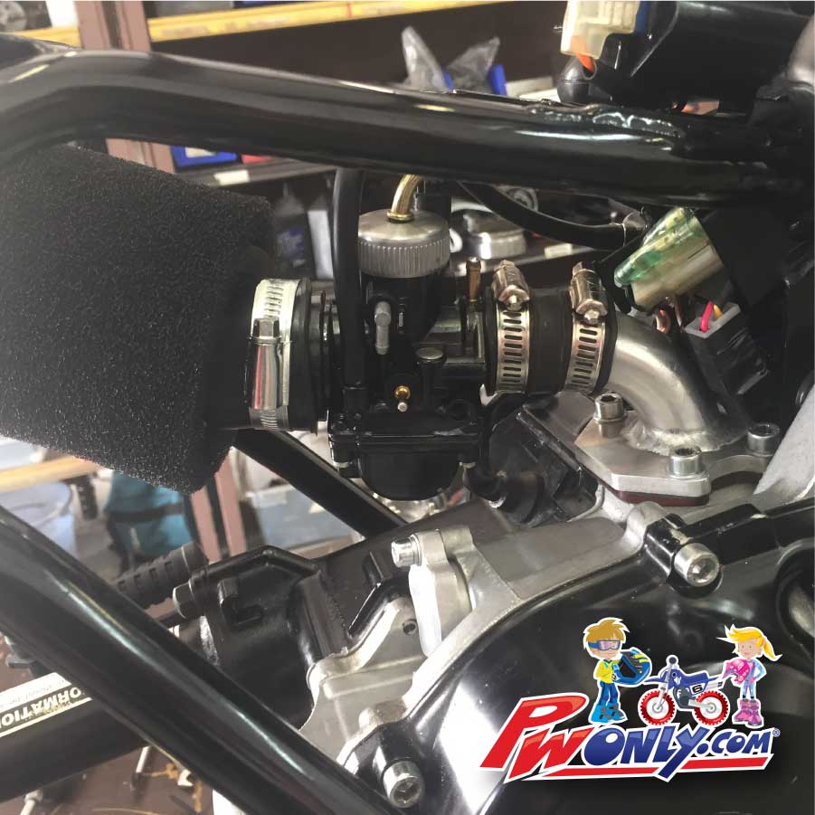 Dollar for dollar the biggest power gain! This bolt on carb kit increases power all across power curve and its quick and easy to assemble. Stock Yamaha PW50 engine or full modified PW50 with big bore 60cc cylinder, this carb kit would be a huge advantage over stock OEM carburetor. Top End Machine alloy intake manifold and Black Dragon race carburetor are designed and scaled to fit PW50 frame and engine without hanging out or interfering with rider’s leg.