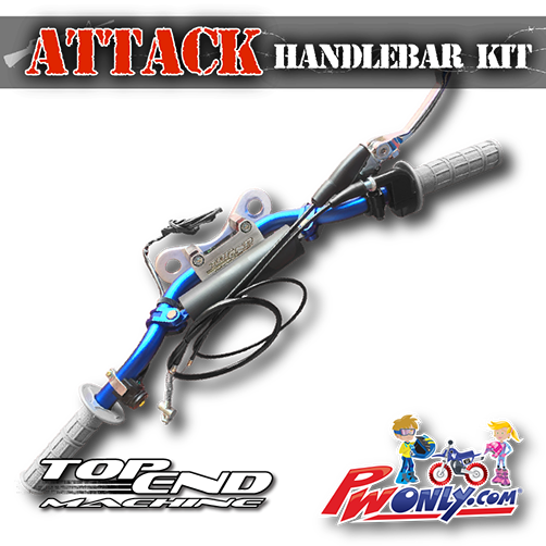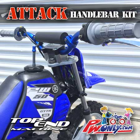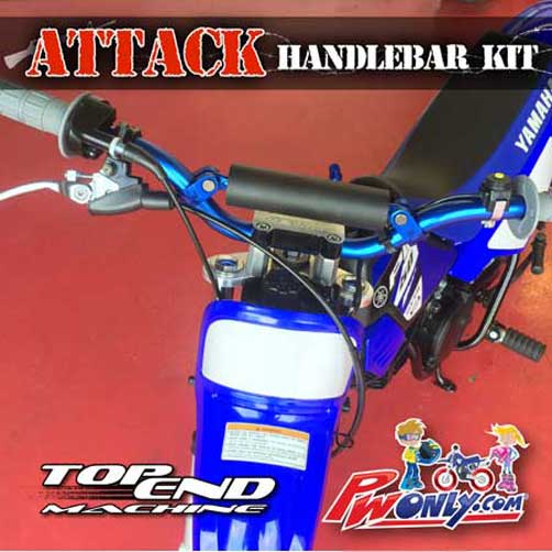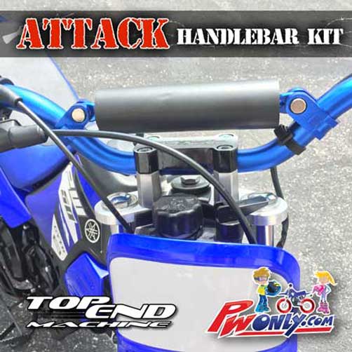 Transform your PW50 with this bolt on PW50 TOP END MACHINE Attack Handlebar Kit. Ride with better handling and control with proper motocross form. Straighter bend and slightly taller and wider than stock OEM handlebars. NIGHT AND DAY difference guaranteed to be the coolest thing you can buy for all year PW50s.